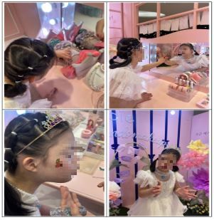 많은 드레스 중 고를 수 있는 드레스가 선택의 폭이 좁아 어떤 드레스가 *연이에게 어울릴지 고민을 하고 있었는데.. *연이는 다른 드레스가 걸려 있는 곳으로 가더니 “이거!, 이거!”라고 이야기하며 확고한 취향을 보였습니다. 그런 *연이를 옆에서 지켜보시던 직원분이 이 드레스는 원래는 못 고르는 드레스인데 입게 해주셨습니다. 감사 인사를 전하고, 드레스를 입어 봅니다. *연이는 드레스를 입은 모습이 신기한지 거울을 한참 동안 바라봅니다. 왕관과 목걸이도 *연이의 취향에 맞게 골라봅니다. 다음으로는 손톱에 바를 매니큐어를 고릅니다. 손톱에 발라주며 “후~”하고 불어주니 “후! 후!” 따라 바람을 불며 마를때까지 잘 기다립니다. 화장도 빠짐없이 해줍니다. *연이의 생일을 맞아 방문했다고 하니 직원분께서 나비 모양 타투 스티커도 붙여 주셔서 미모가 한 층 더 업그레이드 되었습니다.